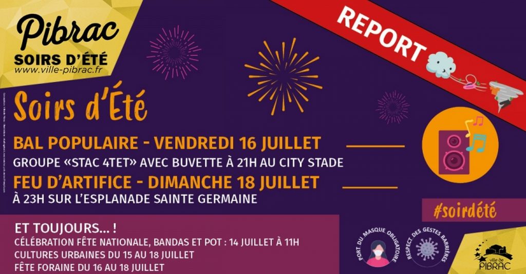 Le mauvais temps étant de retour, le bal populaire et le feu d’artifice prévus dans le cadre des Soirs d’Été à Pibrac sont reportés : Bal populaire avec…