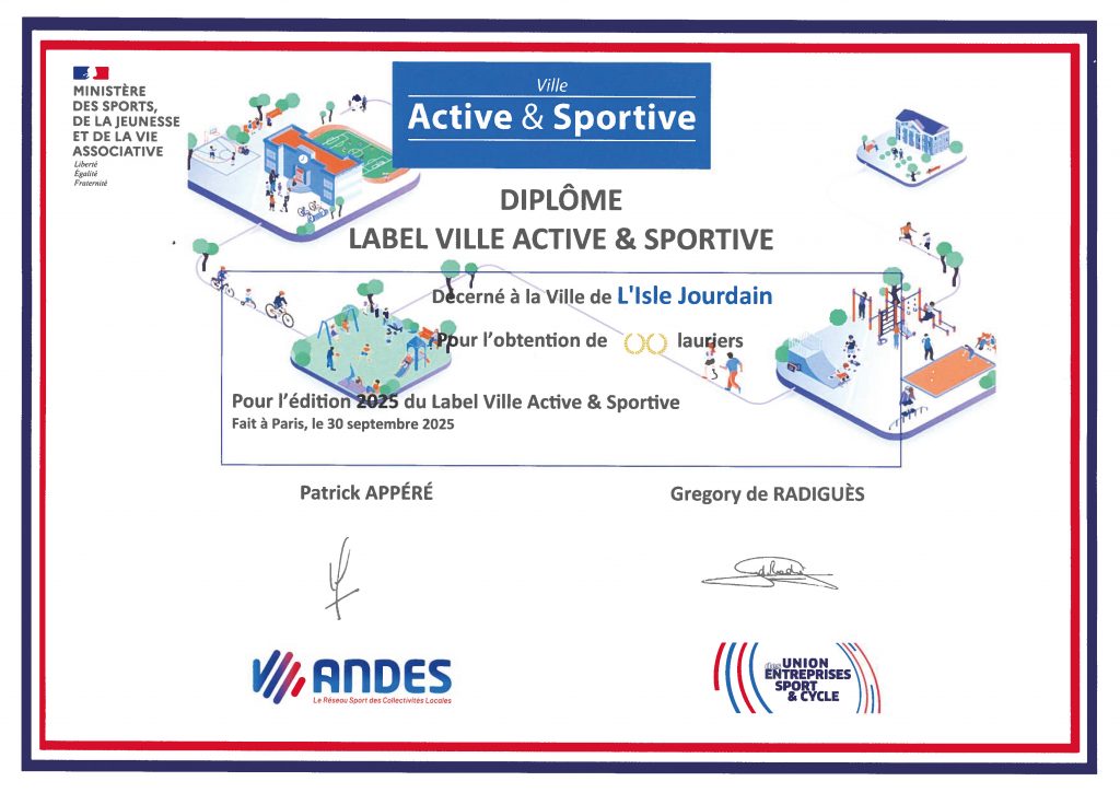 La commune de L’Isle-Jourdain vient de confirmer le maintien de ses deux lauriers au titre du label national Ville Active & Sportive, une distinction qui reconnaît l’engagement de la municipalité en faveur du sport et de l’activité physique pour tous les publics.