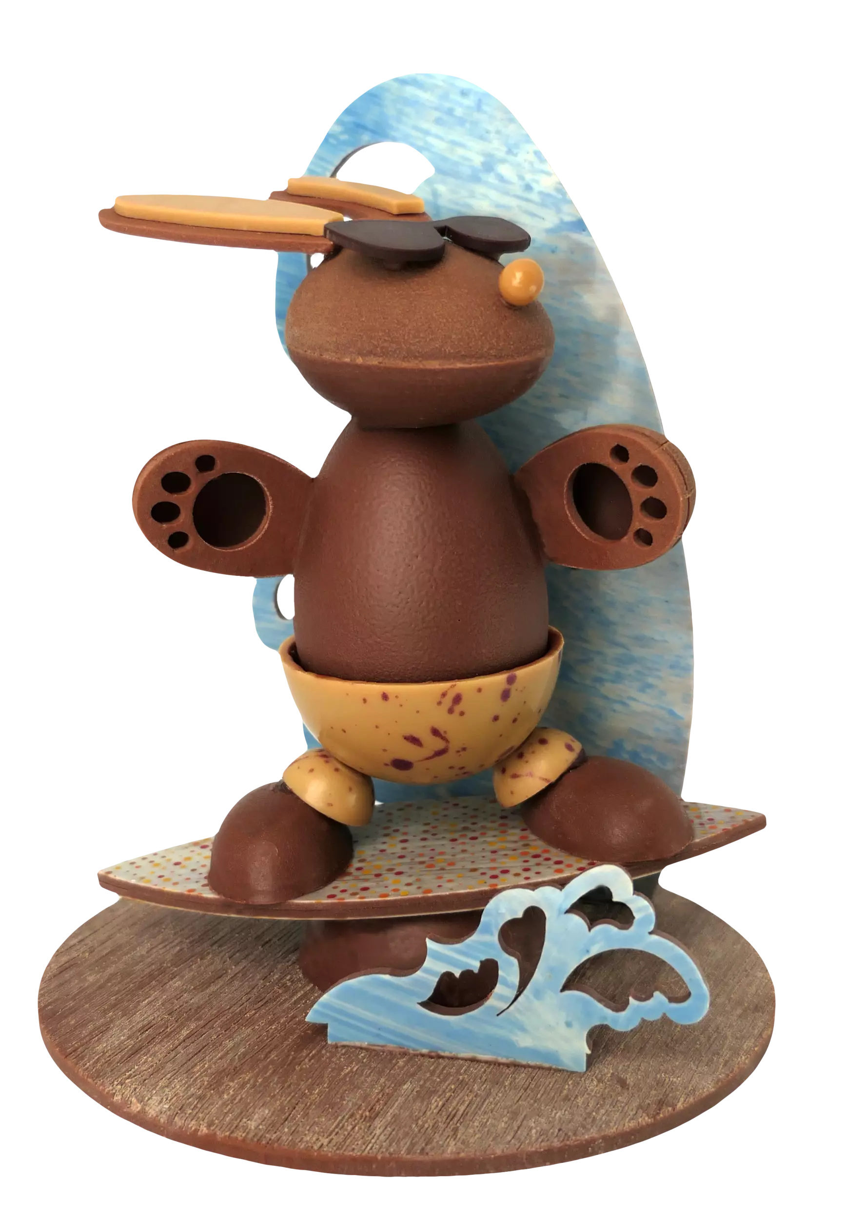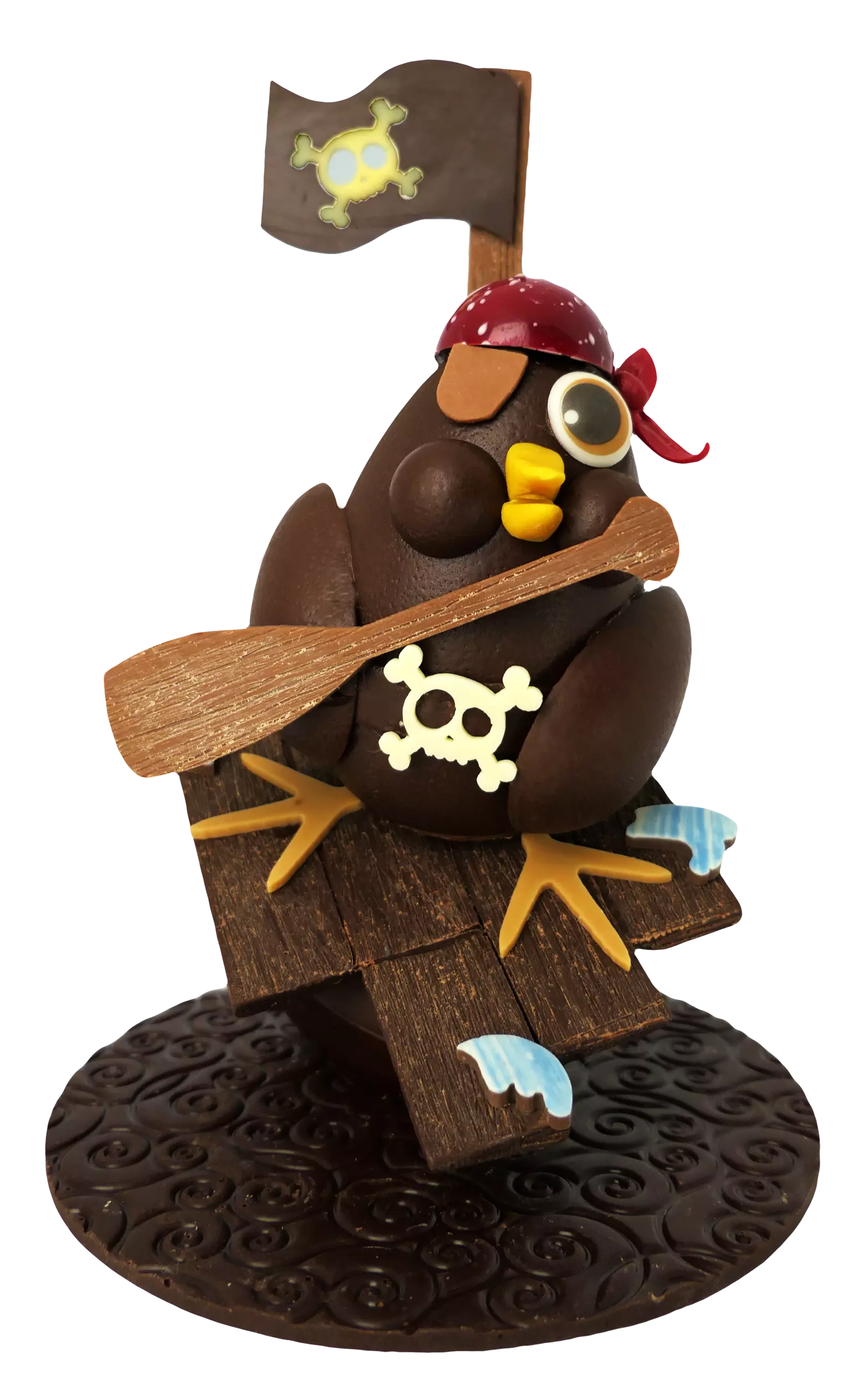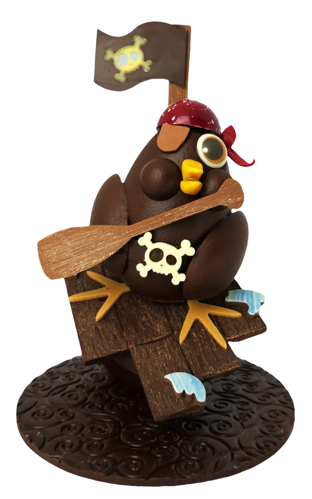 Parmi ces créations, coup de cœur pour le lapin surfeur. Équipé de sa planche et prêt à affronter les vagues gourmandes, ce lapin en chocolat est une création artisanale aussi originale que délicieuse. Réalisé avec soin par les chocolatiers De La Fève Au Palais, il incarne tout le savoir-faire et la créativité de la maison. Une pièce pleine de fun et de gourmandise qui fera sensation à Pâques, aussi belle à offrir qu’à déguster. Pour l’accompagner, l’Oiseau Pirate en chocolat ne manque lui aussi pas de style.