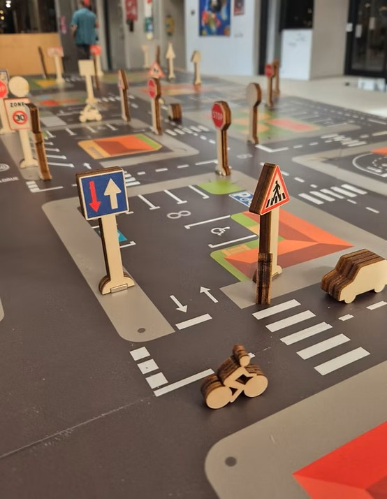 Intitulé « Code de la route vu du ciel », cet atelier développé par Cyclodoux et animé par la Maison du Vélo de Toulouse se déroule en intérieur autour d’un plateau de jeu représentant des aménagements urbains. Accessible et interactif, il permet d’aborder concrètement le partage de la route entre automobilistes, cyclistes, piétons et transports en commun.