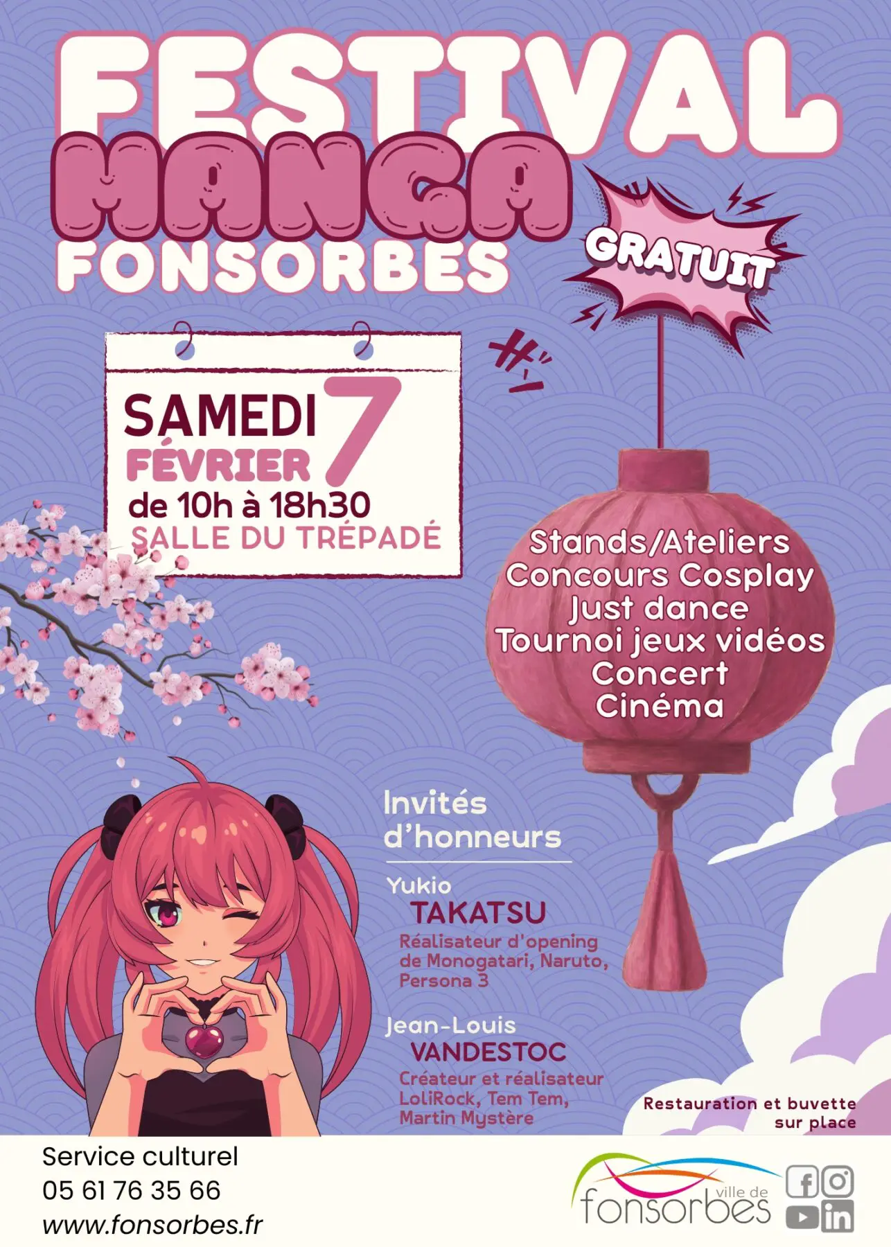 Le Festival Manga Fonsorbes est libre et gratuit, il sera accompagné de différents food truck de spécialités japonaises qui assureront la restauration et d’une buvette (payant).