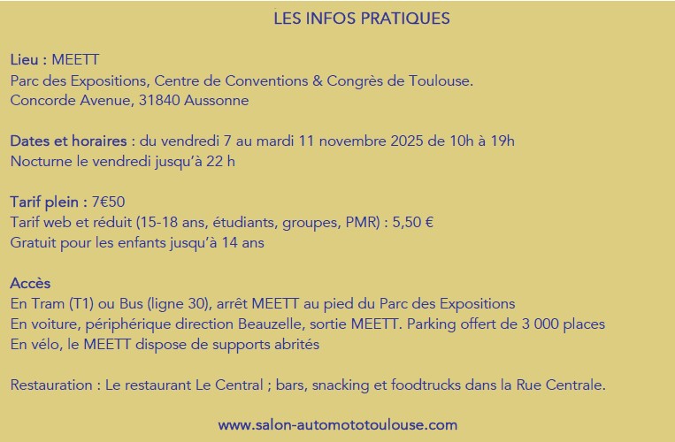 Avec plus de 60 marques automobiles, deux-roues et utilitaires, des services et un grand nombre d’animations inédites, le Salon Auto Moto & Mobilités revient durant 5 jours au MEETT, Parc des Expositions et Centre de Conventions & Congrès de Toulouse. L’édition 2025 met l’accent sur l’innovation et l’expérience visiteur, avec une ouverture prolongée jusqu’au mardi férié. Plus de 30 nouveautés seront présentées au public, dont une large majorité de véhicules électriques. Le salon confirme sa place de grande plateforme des mobilités du grand sud.