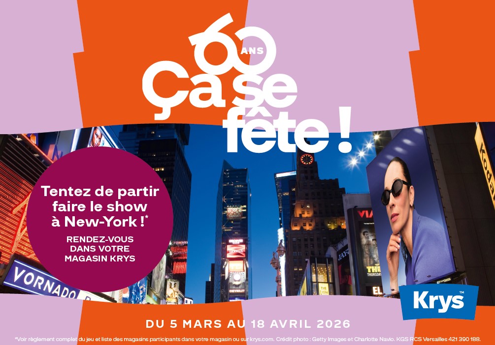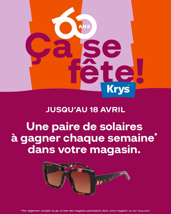 Pour cet anniversaire exceptionnel, les équipes Krys Colomiers et Krys Tournefeuille vous font gagner des cadeaux ! Du 5 mars au 18 avril, remplissez un bulletin de jeu en magasin. Chaque samedi de cette période, un tirage au sort est effectué en magasin avec à chaque fois une paire de solaires à gagner ! Lors de votre participation, vous pouvez également jouer en ligne pour un grand concours national avec un voyage à New York à gagner !