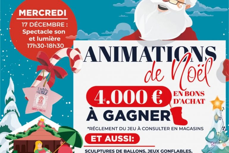 C’est ensuite du samedi 20 jusqu’au 24 décembre que se tiendront diverses animations au débat de la place de l’hôtel de Ville. Calèche, petit train, sculpteur de ballons, manège, animateur de rue, jeux gonflables, photobooth et même le Père Noël sont de la partie. Pour participer aux animations, le public est invité à se rendre chez les commerçants pour y récupérer des tickets. Cette façon de faire est remarquable. En plus de proposer la gratuité de ces animations, le dispositif mis en place par J’Achète À l’Isle pousse les visiteurs à découvrir les boutiques. Dans la même veine de dynamisation, des bons d’achat de 50€ par boutique seront à gagner par le biais d’une tombola. Mieux encore, par le biais du photobooth, des bons d’achats éphémères (à valoir sur le moment) de 5€ seront à gagner. Là encore, ça pousse à la découverte ! Toujours en mode tombola, 3 babyfoot seront à gagner tout au long de ces jours de fête.
